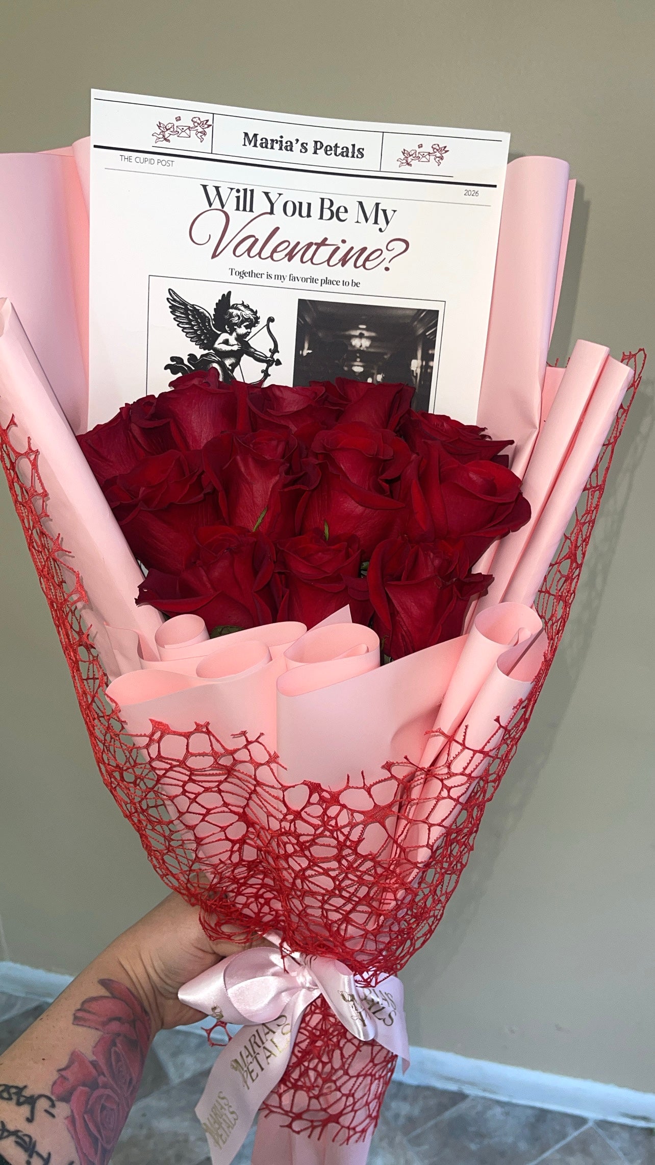 Maria’s Petals exclusive proposal dozen features a customized newspaper article. Add your own image & message, the perfect keepsake for her ❤️